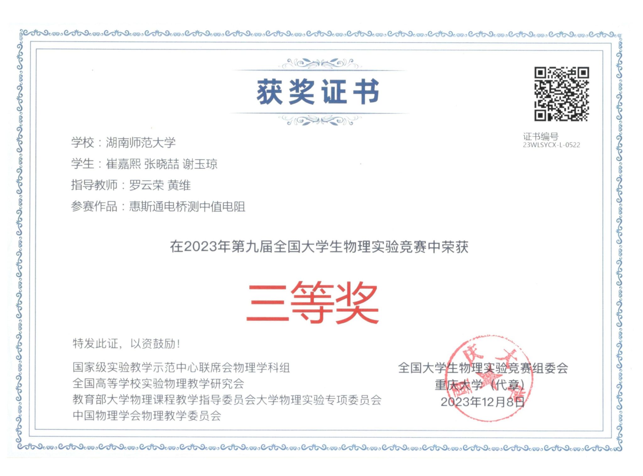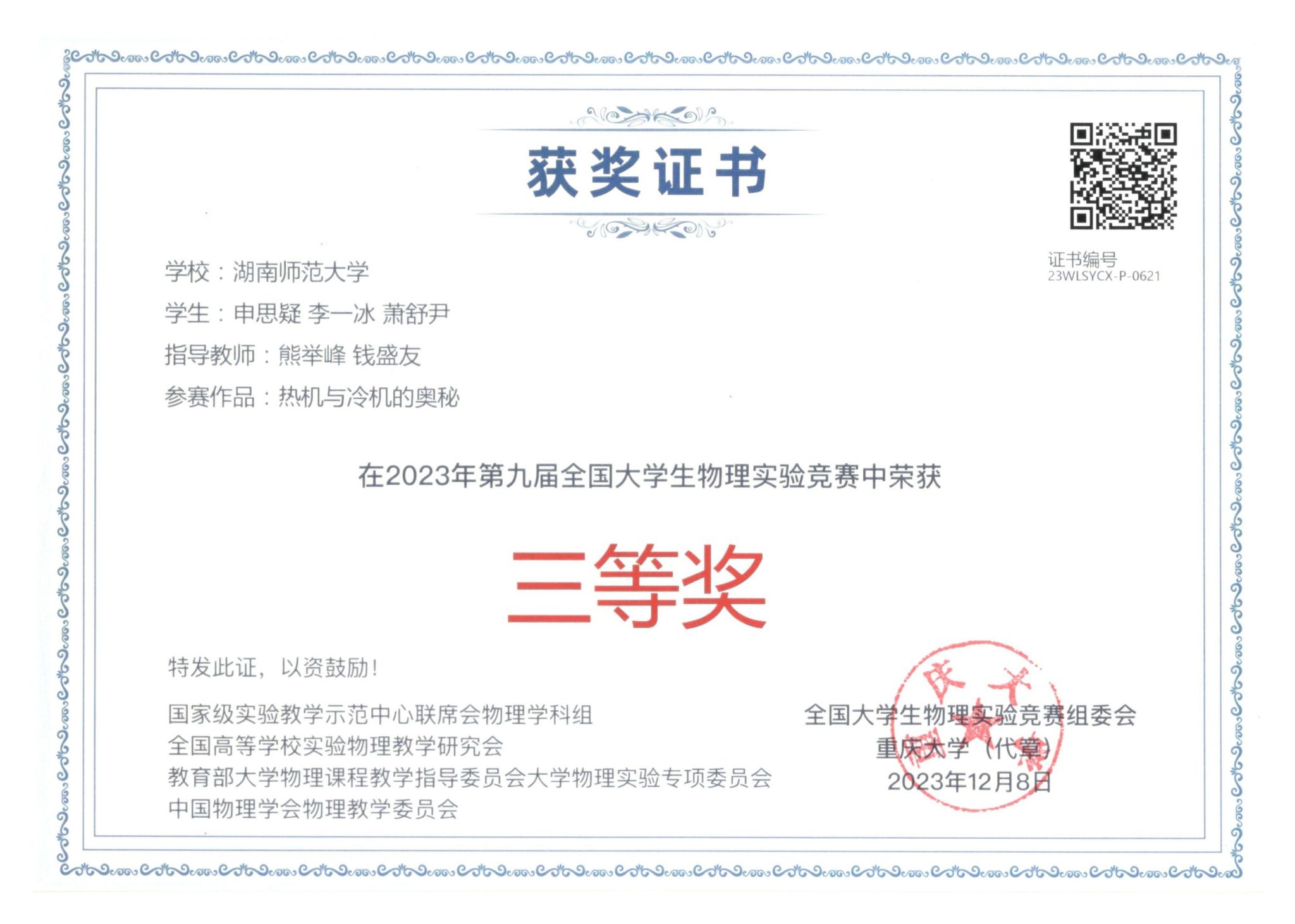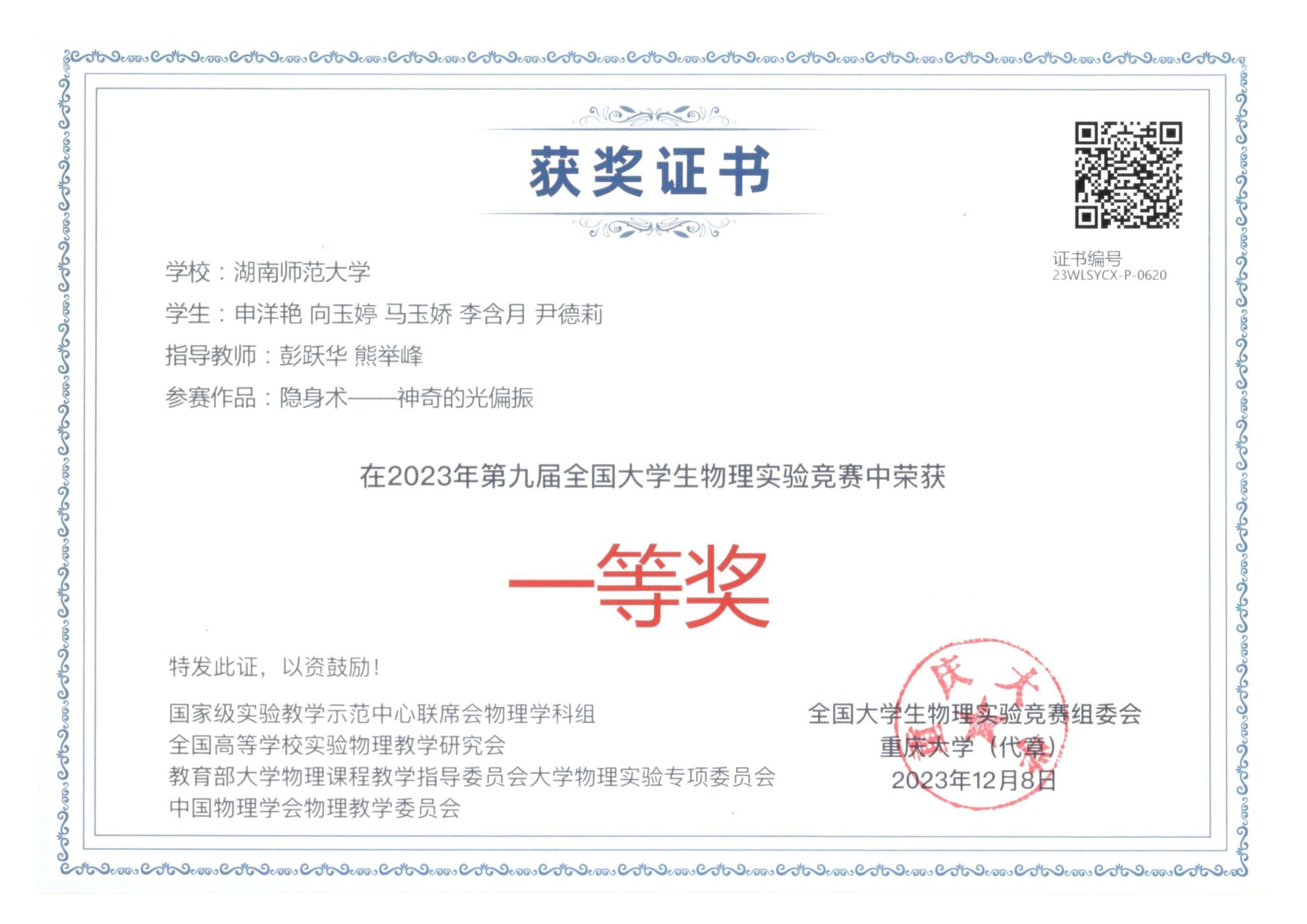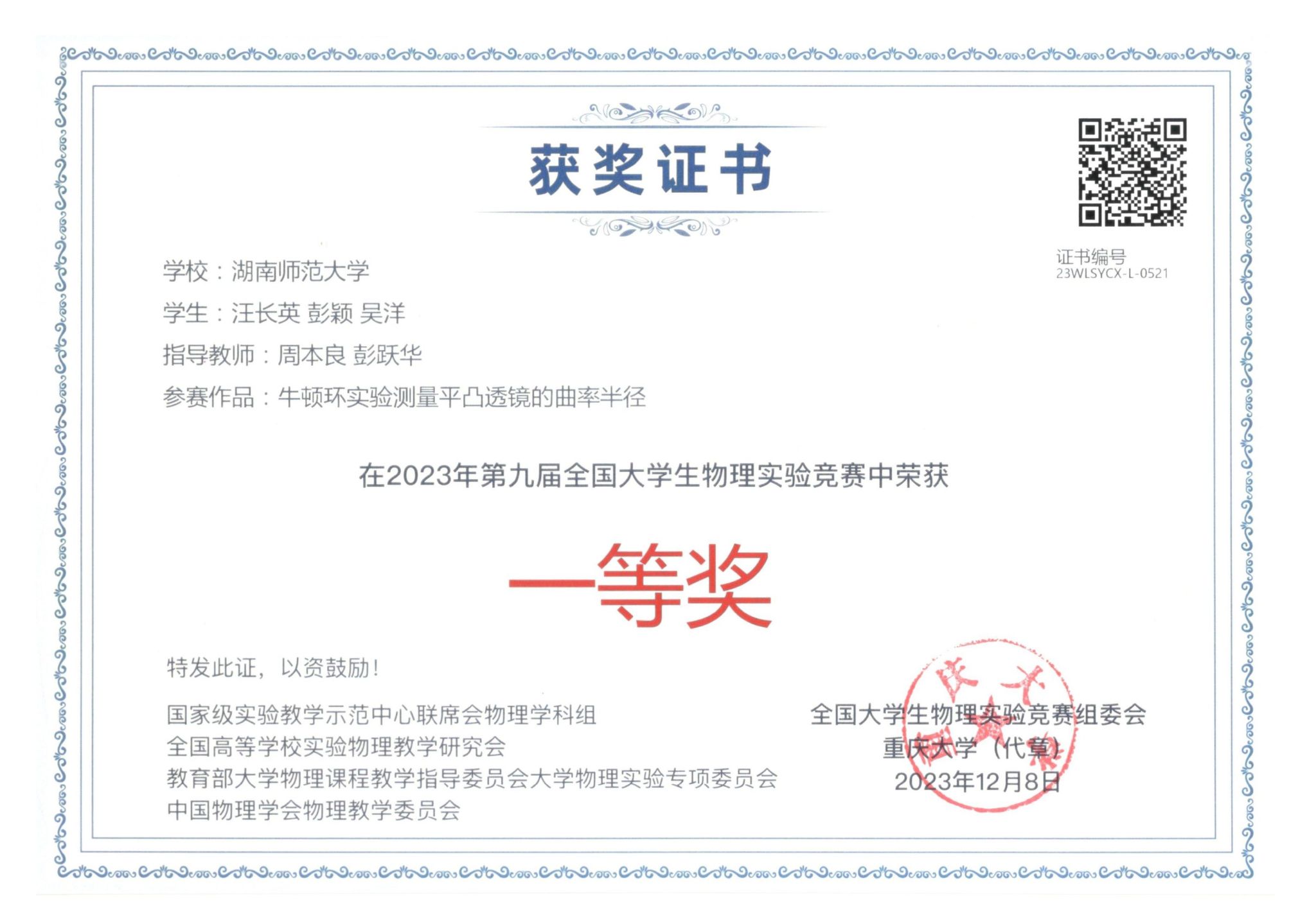 2023年第九届全国大学生物理实验竞赛获奖