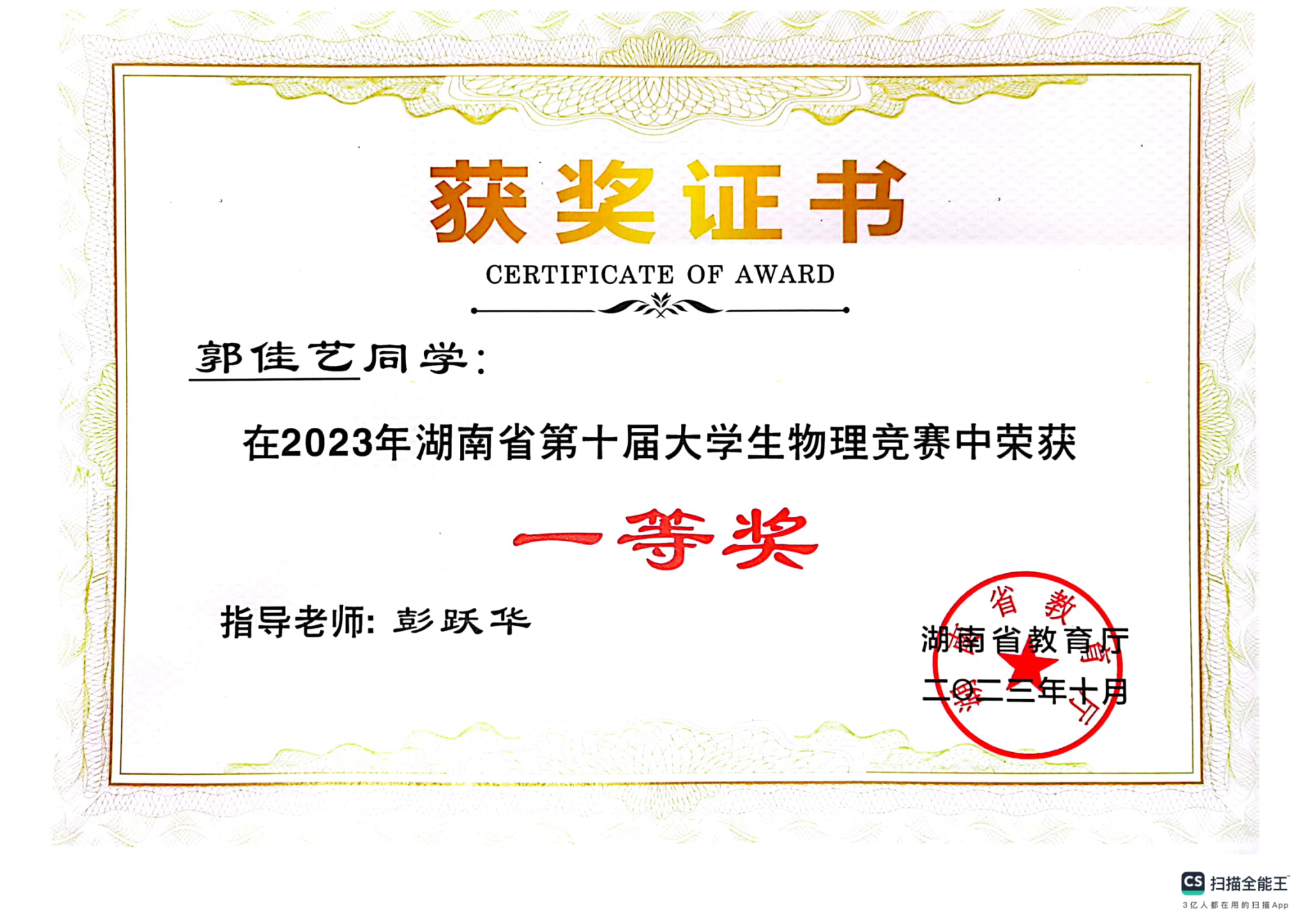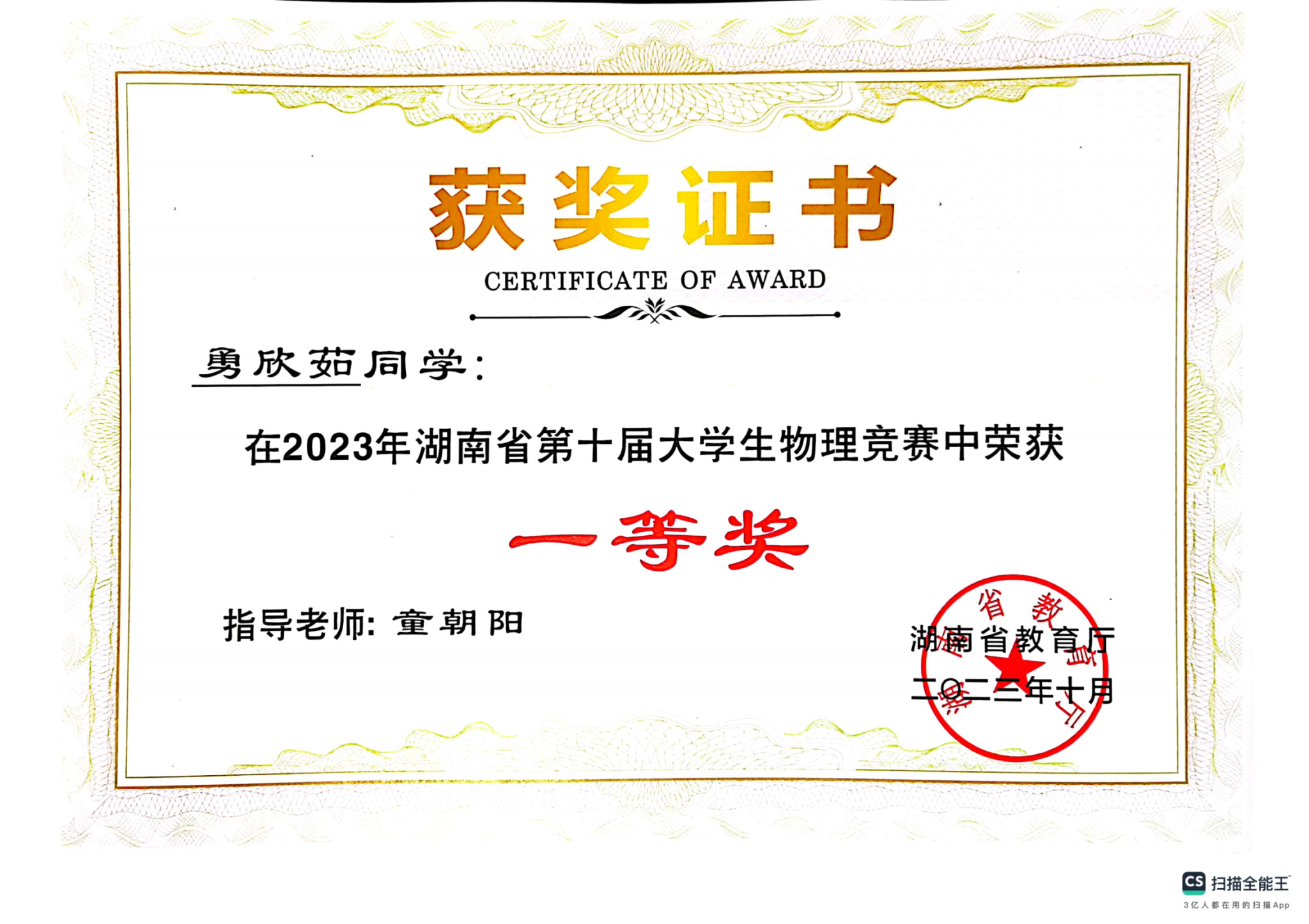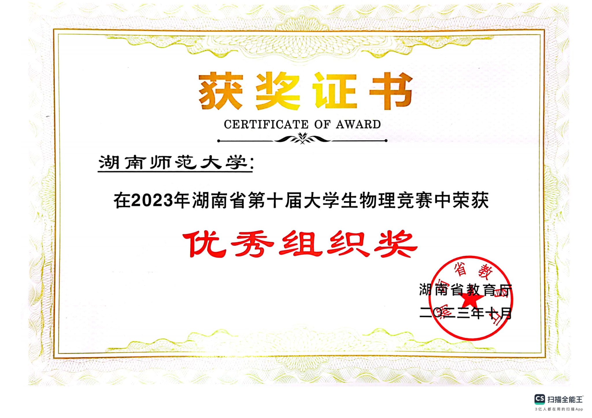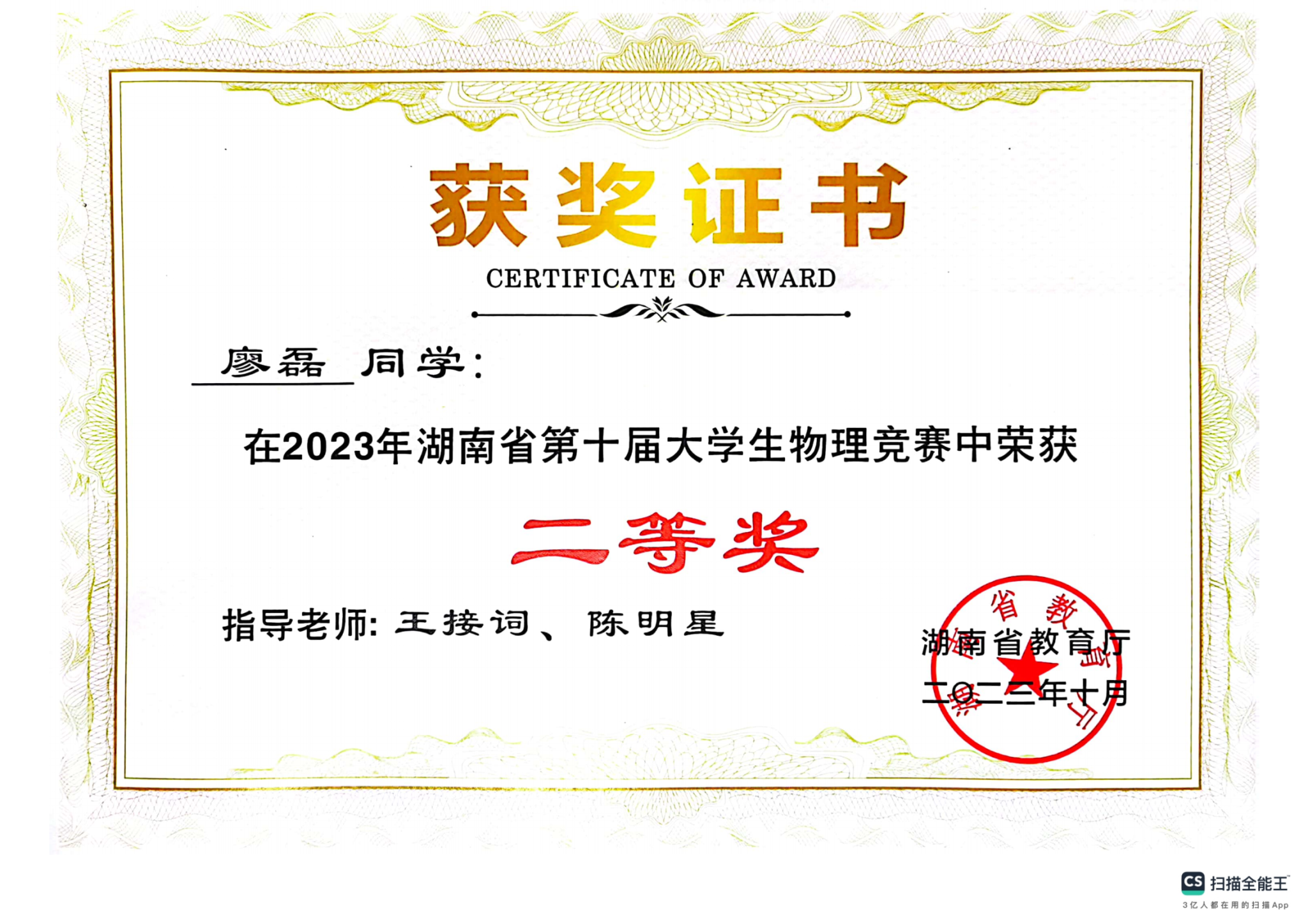 2023年湖南省第十届大学生物理竞赛获奖