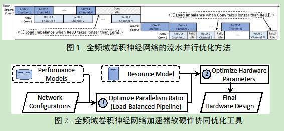 近年来,卷积神经网络在学术界和工业界取得了巨大成功并得到了广泛应用,但是受限于其计算复杂度和计算资源,在面向边缘计算时往往难以满足实时应用的速度要求。为解决该问题,刘双龙教授提出了一种全新的满足在频域计算卷积神经网络的设计方法和硬件优化工具。基于前期研究工作(https://ieeexplore.ieee.org/abstract/document/9474171),该论文提出了全频域卷积神经网络硬件加速器的软硬件协同优化方法(图1)和工具(图2),该方法支持硬件执行时的层内流水并行和层间流水并行,最大化地提升了算法的计算效率和计算速度,从而有效解决了卷积神经网络在边缘端的计算力瓶颈问题。