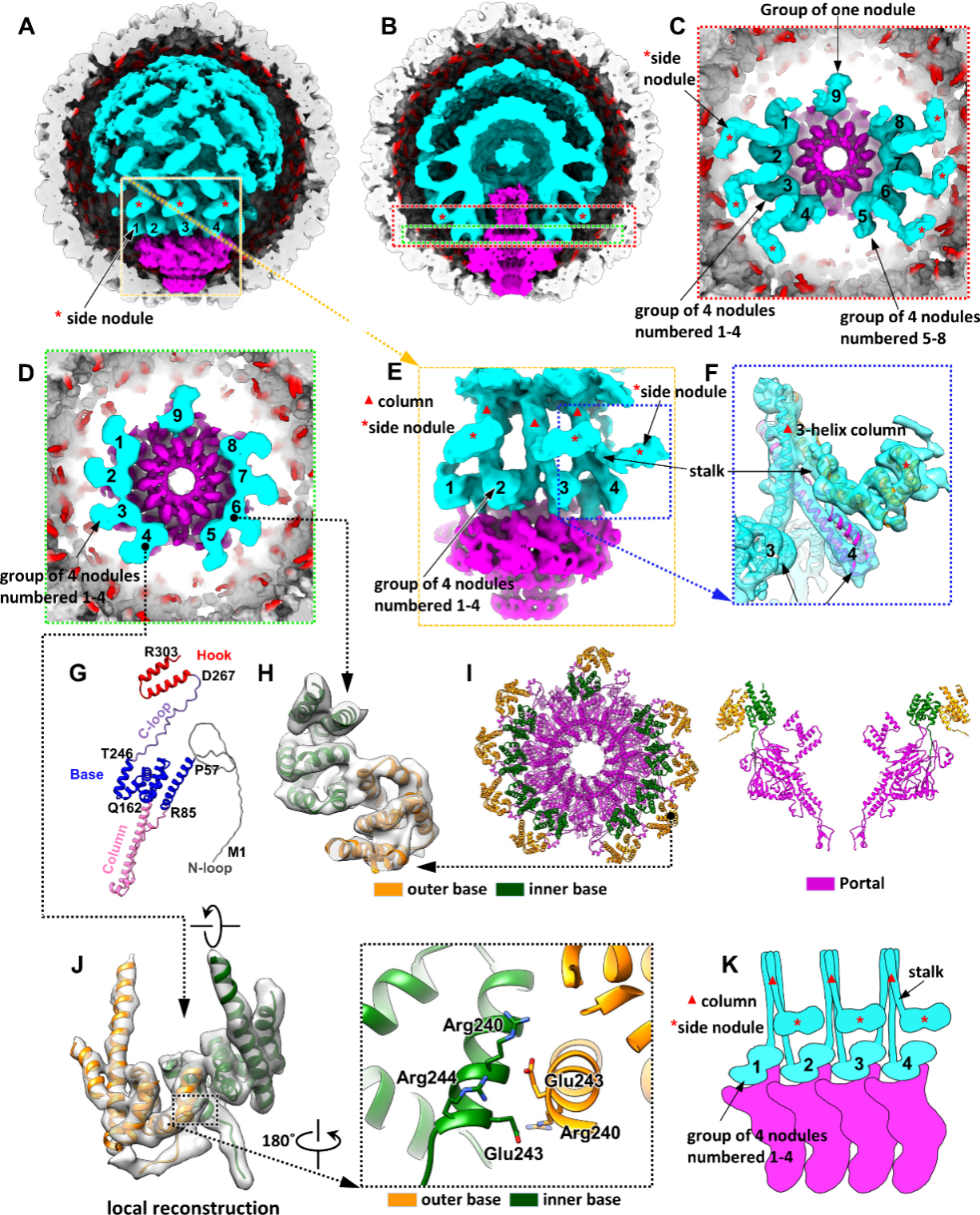 刘红荣教授团队利用冷冻电镜单颗粒技术、非对称重构和局部重构算法,解析了模式噬菌体P22前衣壳非对称完整结构以及支架蛋白和门户蛋白3-9 Å分辨的三维结构。基于所解析的结构并结合alphafold预测模型,搭建了噬菌体P22前衣壳状态下门户蛋白的准确原子模型及支架蛋白网络的骨架结构,发现支架蛋白通过三聚体和四聚体相互作用形成内部穹顶状网络结构,剖析了支架蛋白辅助门户和衣壳蛋白的前衣壳组装过程,完善了噬菌体组装的分子机制。同时提出包括疱疹病毒在内的其他dsDNA病毒可能也采取了这种组装策略。