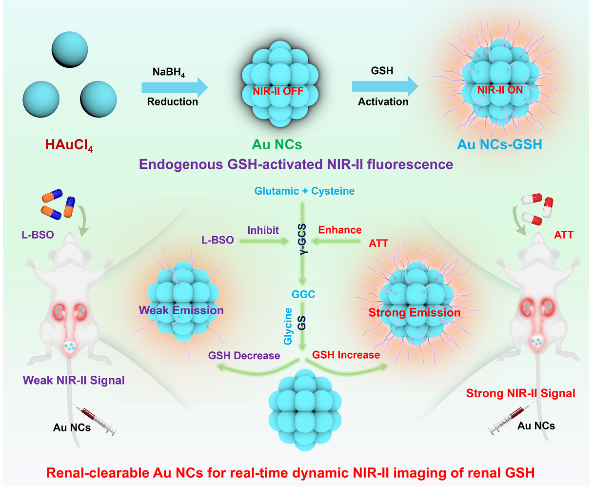 曾松军教授团队基于配体到金属的电荷转移策略,构建了一种GSH特异性激活的金纳米团簇,用于体内肾脏GSH表达水平的NIR-II精准成像。该研究采用聚乙烯吡咯烷酮介导的氯金酸原位还原法构建纳米体系,所制备的金纳米团簇呈现无荧光发射性质。而通过GSH的特异性激活,该探针在808 nm激光激发下可产生浓度依赖的NIR-II荧光响应,成功实现了原位肾脏GSH水平的实时动态监测与代谢可视化。该研究为肾脏GSH相关疾病的早期诊断和疗效评估提供了新型无创可视化成像方法。