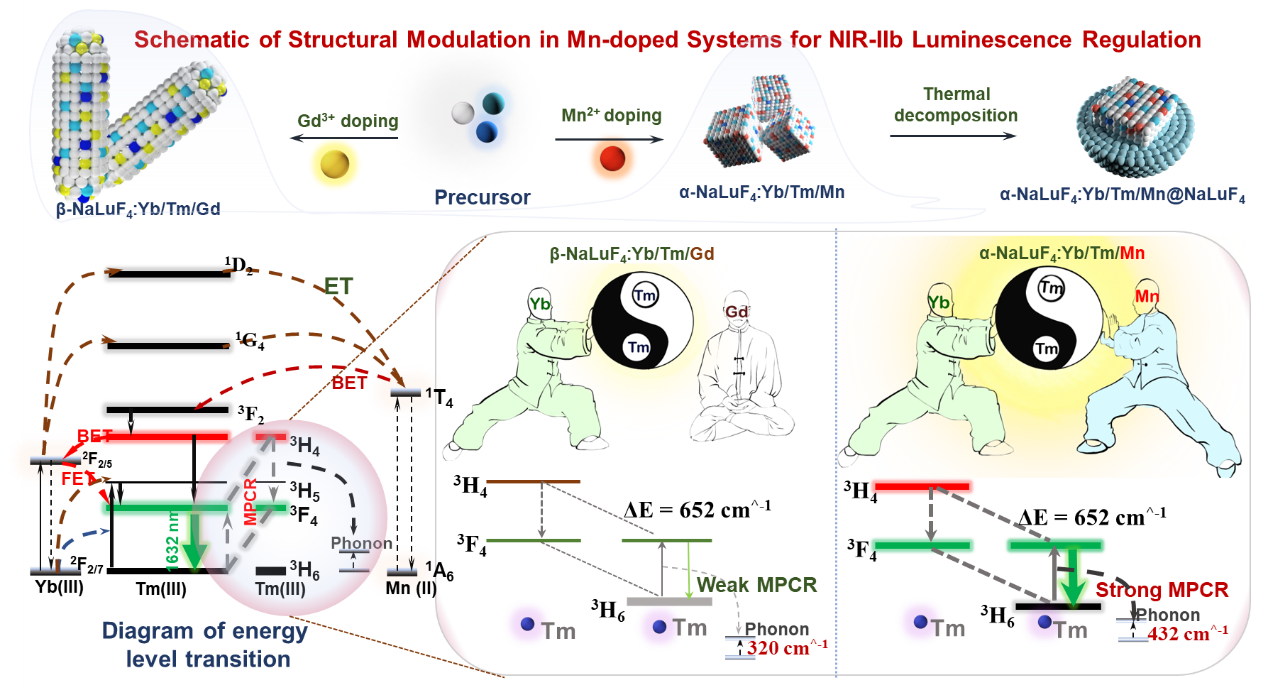 基于此,伟德国际victor1946物电院曾松军教授团队提出一种通用的锰离子(Mn²⁺)发光调控策略,成功解决了NIR-IIb纳米探针发光效率低的问题。以NaLnF4:Yb/Tm(Ln=Lu、Y、Yb)为基质,通过Mn²⁺掺杂实现三重调控:一是诱导晶体结构从六方相(β相)向立方相(α相)转变;二是调控声子能量提升能量交叉弛豫效率;三是构建Tm³⁺-Mn²⁺高效能量转移通路,显著增强多声子介导的交叉弛豫(MPCR)过程。经亲水性修饰后展现出卓越的生物成像性能,实现了高分辨血管、骨骼及肠道深组织光学成像。这一成果为设计用于深组织光学成像的高效NIR -IIb纳米探针提供了一种新的发光调控方法。