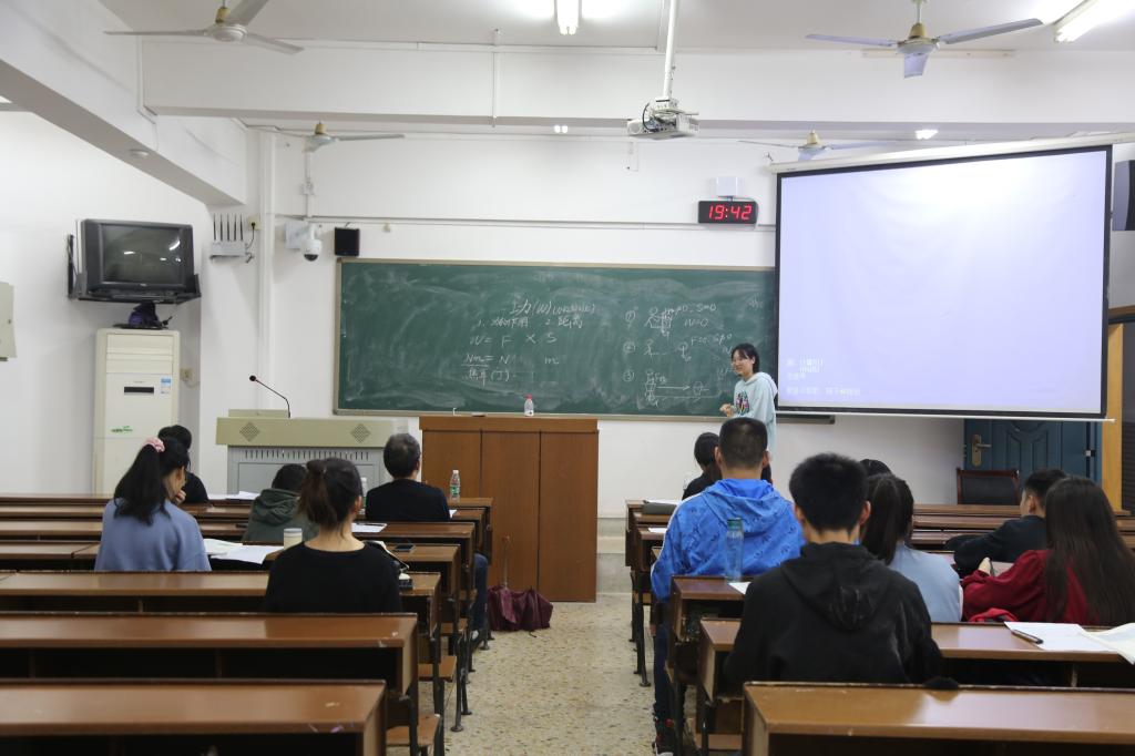 2018级学生代表进行试讲授课。物理系刘健智教授从她的教学内容、课件设计、板书、语言表达等方面进行点评。