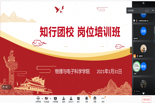 bv伟德国际1946团支书工作经验总结交流会于1月31日中午在腾讯会议线上展开。2019级物理学班马倩倩担任此次会议的主讲人。岗位培训班全体成员参加此次会议。