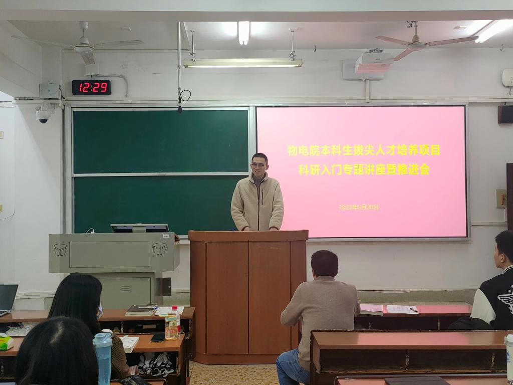 任昌亮向同学们展示了物电院院系的发展历程和学科设置,并介绍了物电院的师资队伍情况和科学研究方向。他指出,科研是创造性的工作,是对未知的探索和认识的过程,根据研究的目的、任务和方法的不同而划分出不同的类型。做好科研工作,需要选取合适的方向,充分利用现代工具,广泛获取学术资源,培养自己的风格与特色。他建议同学们在学好基础课程之上,拓宽科学视野,在阅读文献中增强提问与思考能力,积极、礼貌地与老师和组员沟通,讲究学术规范。