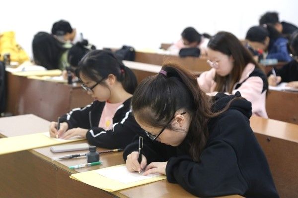 大赛评比内容包含硬软笔书法测试、笔试作答与教学比武三部分,从多方面对参赛选手的师范技能进行现场考核。在硬软笔书法测试现场,选手们斟酌落笔,认真书写,一幅幅或隽秀柔美,或遒劲有力的作品呈递至监考员手中,充分展示出选手们扎实的书写功底。笔试作答阶段,选手们高度集中注意力,专注于手中含教资及物理相关题目的试卷,进行谨慎作答。