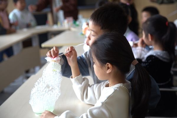 活动内容主要包括彩虹泡泡龙、空气炮、带电的气球三个趣味物理实验。志愿者们向大家讲述了实验步骤,对实验原理进行了详细解说,同时介绍了其中包含的基础物理知识及其在生活中的实际运用和意义。在彩虹泡泡龙实验中,志愿者们将涂满色素的纱布套在瓶口,并指导小朋友们往里吹气,无数整齐排列的小泡泡在表面张力的作用下形成了彩虹泡泡龙;空气炮制作实验中,小朋友们在志愿者的指导下进行气球与塑料杯的套装,通过拉伸气球尾部释放杯中压缩气流冲击纸片,体验到了空气炮的“威力”。带电的气球实验中,志愿者给每位小朋友发了两个连在一起的气球,摩擦头发后,气球发生的排斥现象让小朋友们体会到了静电效应的奇妙,也引起了更多孩子对物理的探索之欲。