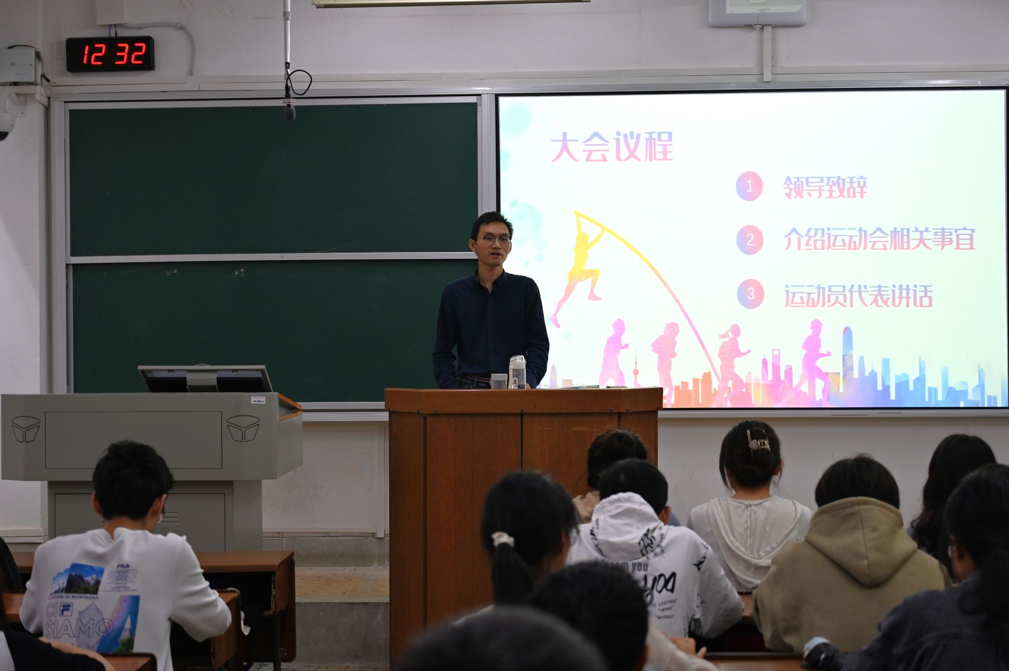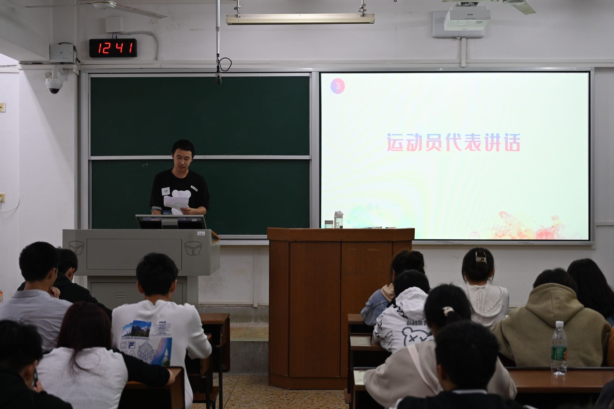 文体部干事廖煦平向参会运动员们介绍了运动会相关事宜及运动会的奖金与补助发放等奖励机制。运动员代表罗杰向运动员们分享过往比赛体验。他认为校运会是物电院学子体现坚强意志的机会,希望运动员们能从运动中感受快乐、勇往直前,为学院争得荣誉。