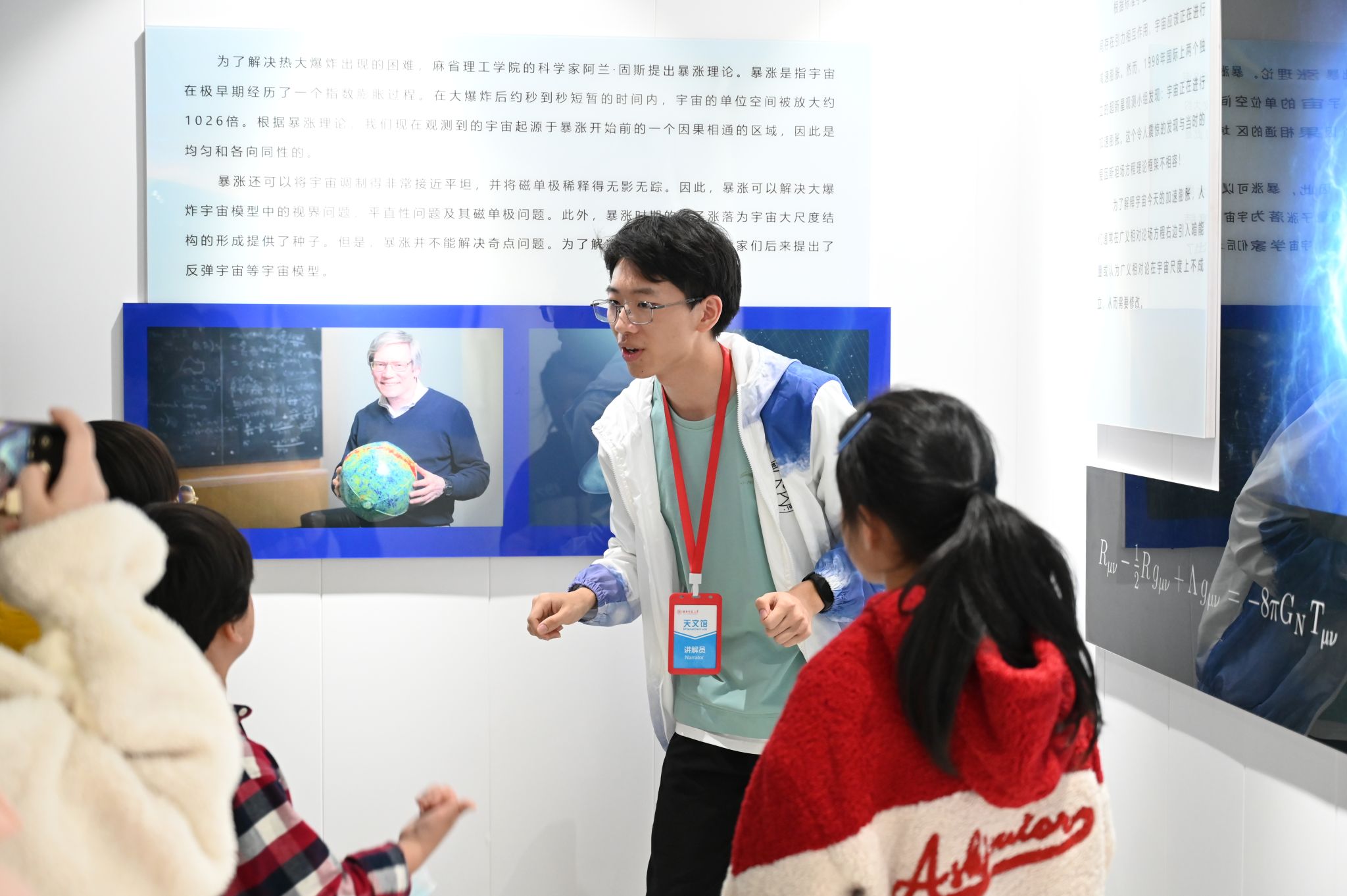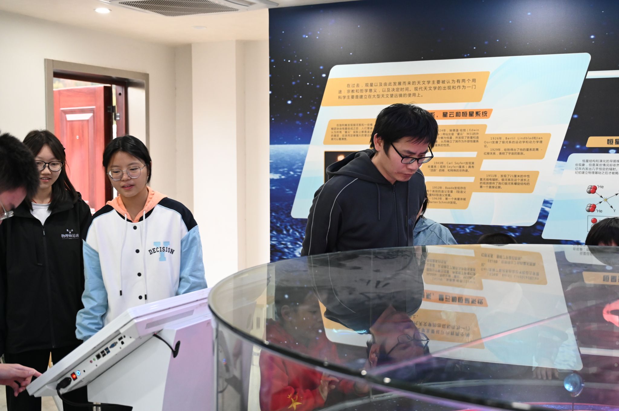 姚睿带领参观者参观伟德国际victor1946天文馆,并介绍了馆内展厅相关天文科普内容与天文馆的内部建设。他从基本的天文知识切入,结合板块内容及天文相关视频,由浅入深地讲解了恒星演化、黑洞形成、太阳系行星运转等天文学知识。为使参观者更深入了解天文学学科,姚睿详细介绍了中国古代天文学发展史,具体说明了天文学对于古代社会生产方面,如纪时、纪年等所起到的重要作用。随着参观过程的推进,参观者们跟随姚睿来到天文馆露台观察专业望远镜和观测相关设备的内部构造,并学习观测原理。