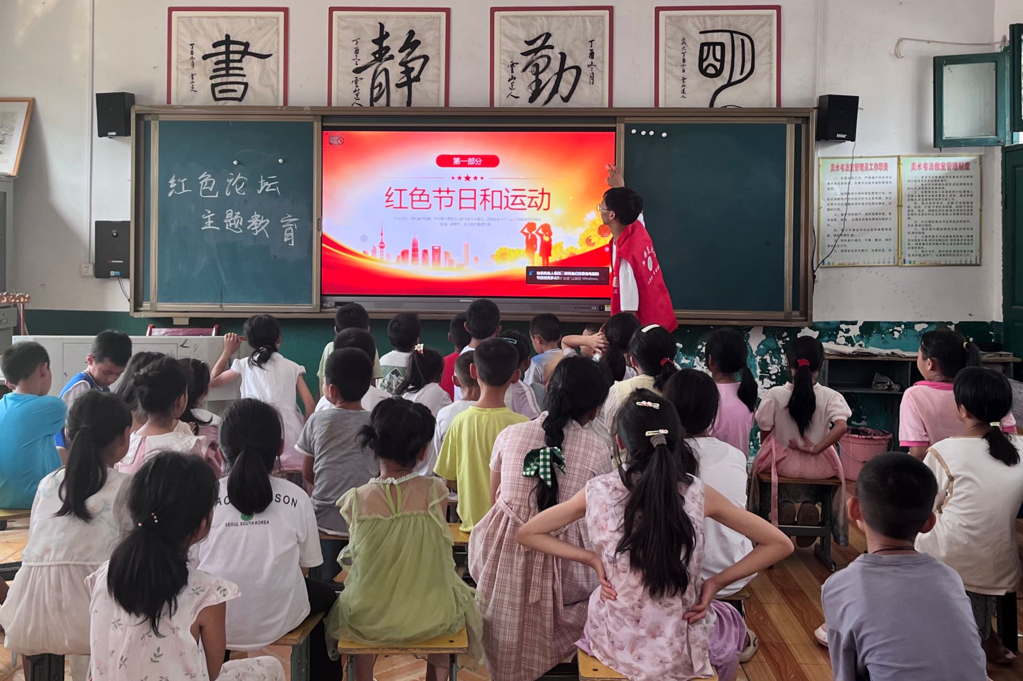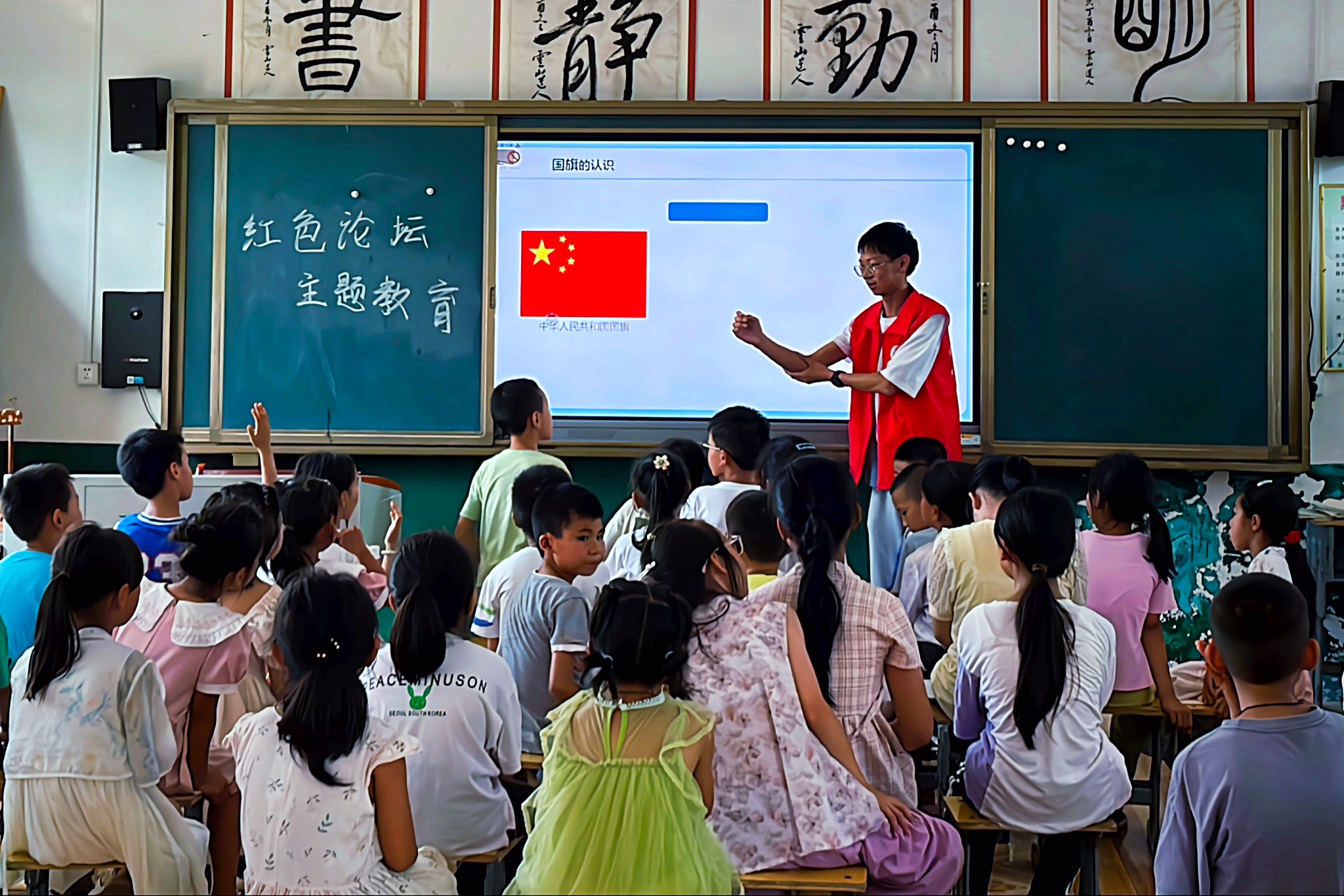 课堂上,周志豪和银锴介绍了国旗国徽的内涵。他们通过奏响国歌,说明了对待国旗、国徽及国歌应保持严肃敬畏的态度。周志豪通过对历史事件的回顾,生动形象地讲述民族历史,并通过问答互动,让孩子们学习、铭记、反思历史,并以麻江镇的“红色基因”为导入,讲述了杨根思、邱少云等革命英雄的事迹,用榜样的力量激起孩子们的爱国情怀。除此之外,银锴还让孩子们说出自己知道的红色节日,解释节日的由来,让大家理解红色节日的内涵。课程结尾,他们带领孩子们共同演唱《唱支山歌给党听》,在歌声中结束此次红色论坛。