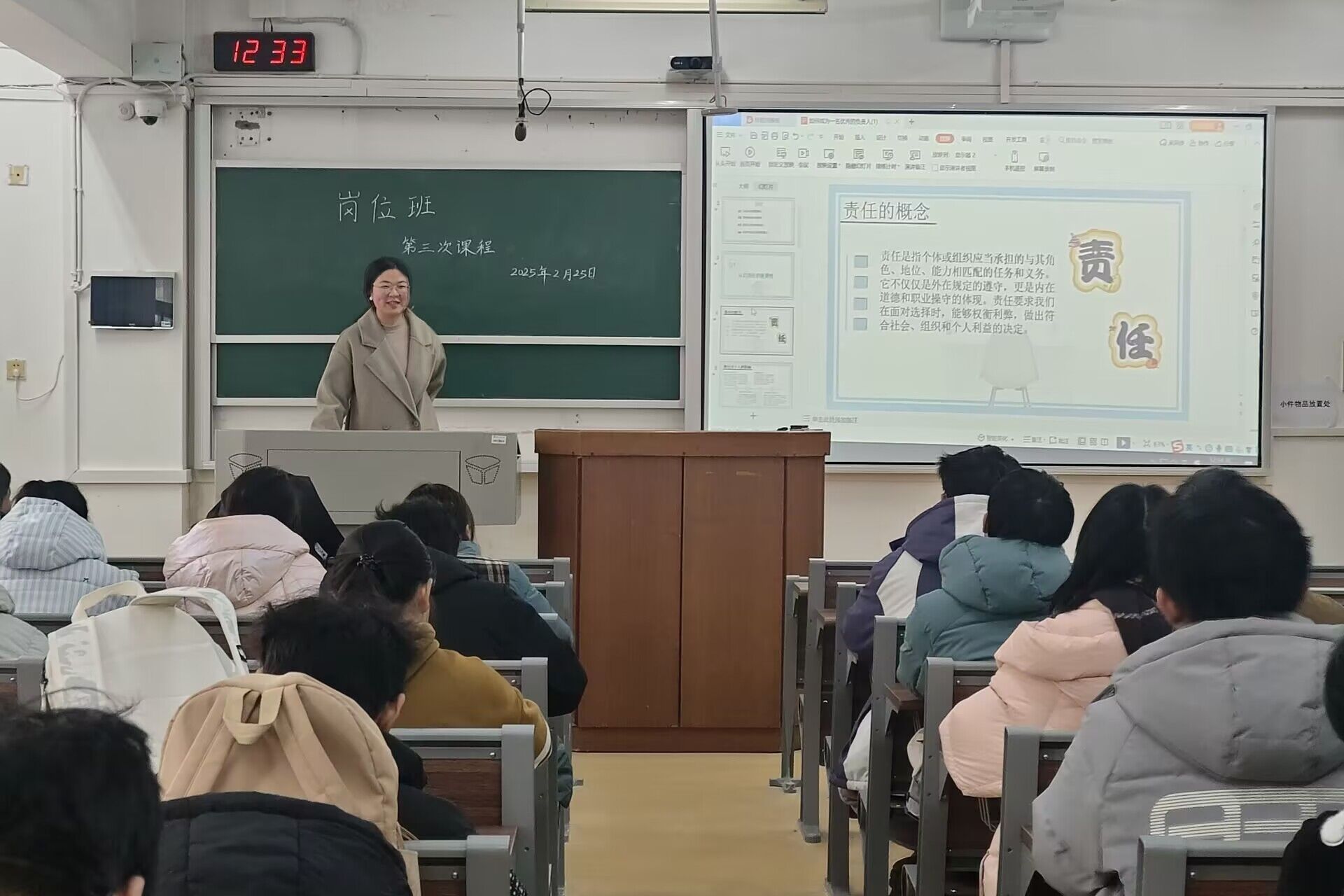何亚亚从责任的重要性、优秀负责人的特质、能力提升和实践成长四个方面展开讲解。在责任的重要性方面,她指出责任对个人是成长基石,能培养自律和担当,提升价值。责任对社会是进步关键,能促进和谐、营造良好氛围、增强凝聚力。同时,她认为,成为一名优秀负责人应具备保持乐观心态,积极面对压力,传递正能量等优秀特质。谈及能力提升的方法,她建议同学们学习时间管理技巧,提升问题解决能力,持续自我提升,并提倡在座学员积极参与校园活动,主动面对挑战与困难,通过实践积累经验,成长为优秀负责人。