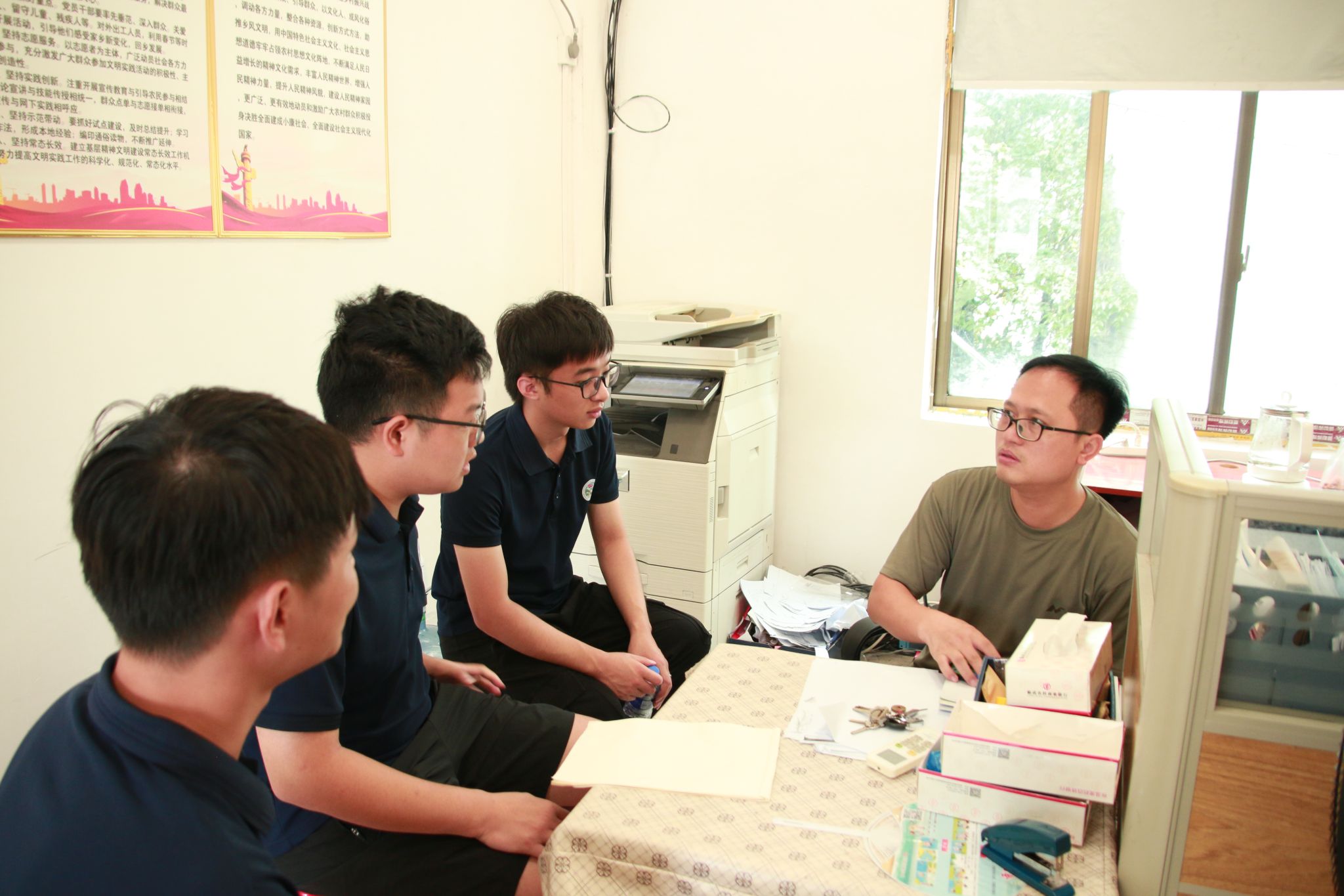 调研组在镇武装部办公室与部长邓庭灿展开座谈,初步了解傩戏发展现状。邓庭灿告诉调研团队,他希望能有更多人了解到水东镇的傩戏非遗文化并对此产生兴趣。为了让队员们深入了解傩戏文化,部长带领团队拜访了当地傩戏传承人,由此深入挖掘这一非遗项目的历史渊源与文化内涵。据传承人所述,临武傩戏所在地大冲乡油湾村的四面环山的独特地形和封闭的生活环境,使临武傩戏世代相传,流传至今。调研过程中,团队详细记录了傩戏服饰、面具等特色文化元素,并与传承人合影留念。