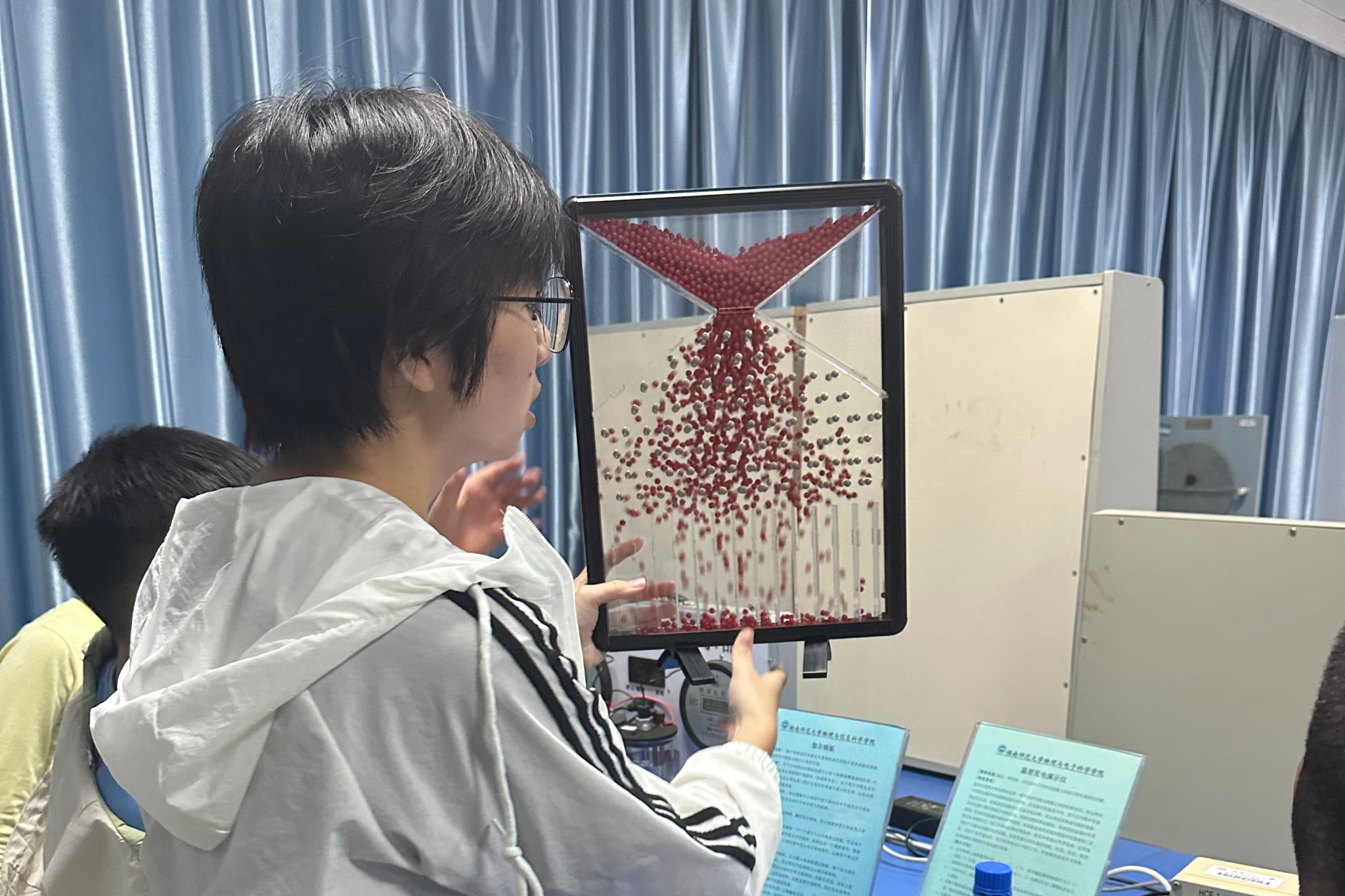 活动进行时,参观人员络绎不绝。志愿者们分工明确,引导、讲解、演示环环相扣,确保现场秩序井然。他们发挥专业特长,将深奥抽象的物理与电子知识转化为生动有趣的讲解,为参观者演示实验、解答疑问。精彩的互动不仅让大家直观地理解了实验原理,更激发了他们对科学探索的浓厚兴趣。