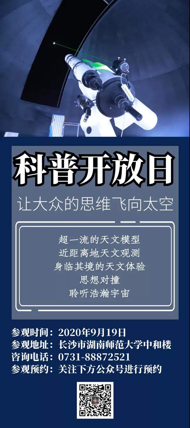为了响应湖南省科学技术协会关于科普活动的系列开展,为了更好地践行伟德国际victor1946天文馆作为省级科普基地的社会职能,伟德国际victor1946天文馆于2020年9月19日(上午9点-12点),免费向公众预约开放。