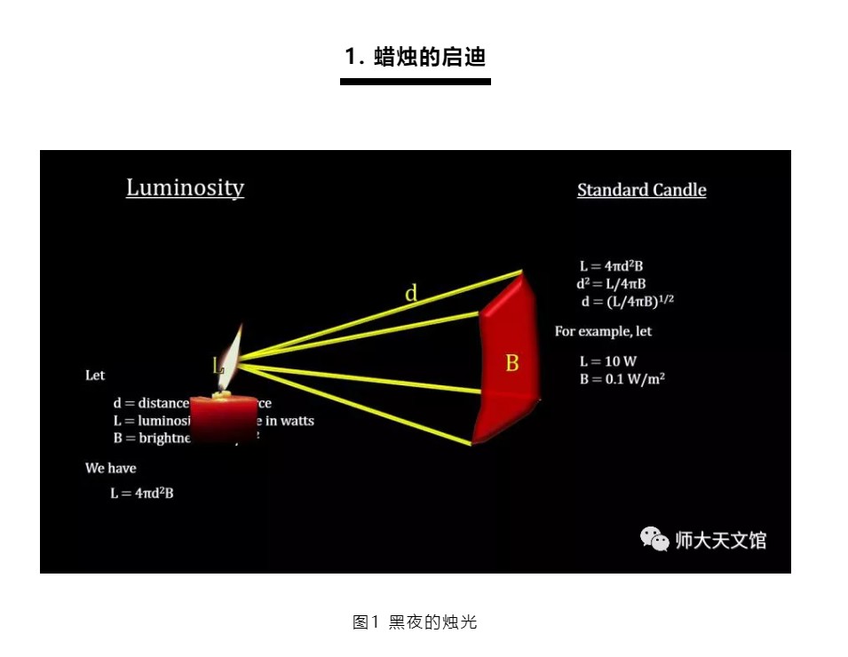 试想在夜晚,如果远处放了一支蜡烛,你会觉得非常昏暗。倘若把蜡烛移动到眼前,便会觉得十分明亮了。蜡烛本身发出的光的强度没有变化,只是由于距离的改变,使得你的眼睛看到的亮度发生了变化。也就是说,亮度和距离存在一种关系,如果我们知道了蜡烛本身的亮度,并测量我们看到的亮度,就可以推算出蜡烛离我们有多远。