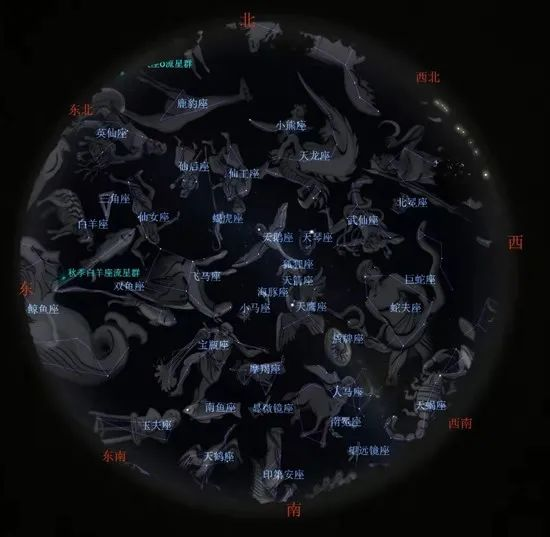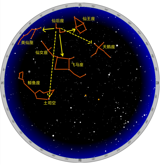 在四季星空中,只有秋季的星空亮星寥寥,没有晚冬早春闪耀的天狼和威武的猎户,没有夏末撒粮的牛郎织女,到初冬以前,夜空显得尤为寂寞。秋季星座最主要的两部分就是北天的王族星座和南天的水族星座。