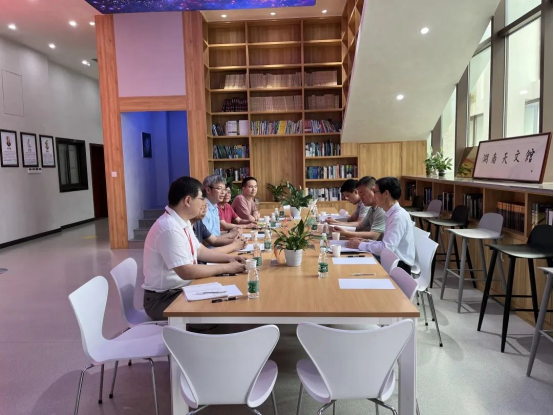 随后,在天文馆7楼,云南天文台纪委书记陈吉岳一行同我院院长唐东升、教授余洪伟等人展开座谈。唐东升院长对陈吉岳书记一行的到来表示欢迎,并详细介绍了天文馆的发展建设和学生培养情况。陈吉岳书记介绍了云南天文台的发展历史、观测基地的规模和师资情况,并对我院学生报考云南天文台表示热烈欢迎。云南天文台党办杨光普副主任则分享了自己的几点来访感受并就场馆建设提出了几项实质性建设意见。余教授则提到双方交流合作历史悠久,建议进一步加强长期合作友好关系。此外,双方还就学生培养、本科天文课程开展等领域深入沟通交流。