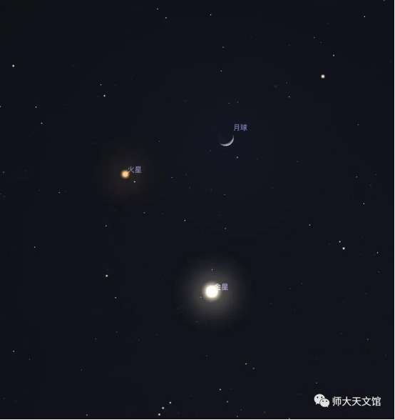 22日傍晚,月亮与金星、火星最近,此时金星与火星相距4.5°,月球在火星北3°左右。这三个明亮的天体在西方天空组成了一幅有趣的画面,值得观测和拍摄。此时金星亮度约为-4.6等,火星亮度约为1.7等。