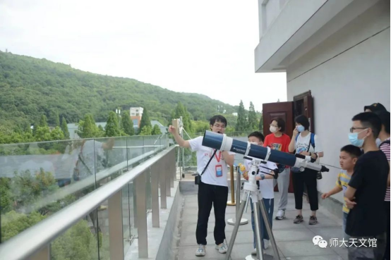 为了让大家更深刻地感受到望远镜的神奇的作用,天文馆八楼的露台架设有望远镜,讲解员们上午带领大家观测我们市的电视塔,下午进行观测太阳以及“白天的月亮”活动。