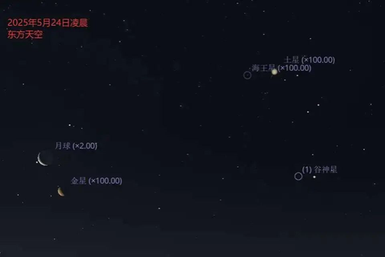 5月24日06:15是年度最大残月(36万2849.76km),07:51金星合月(视赤经1h06m58s),地心所见金星在月球以南3.99度的地方。