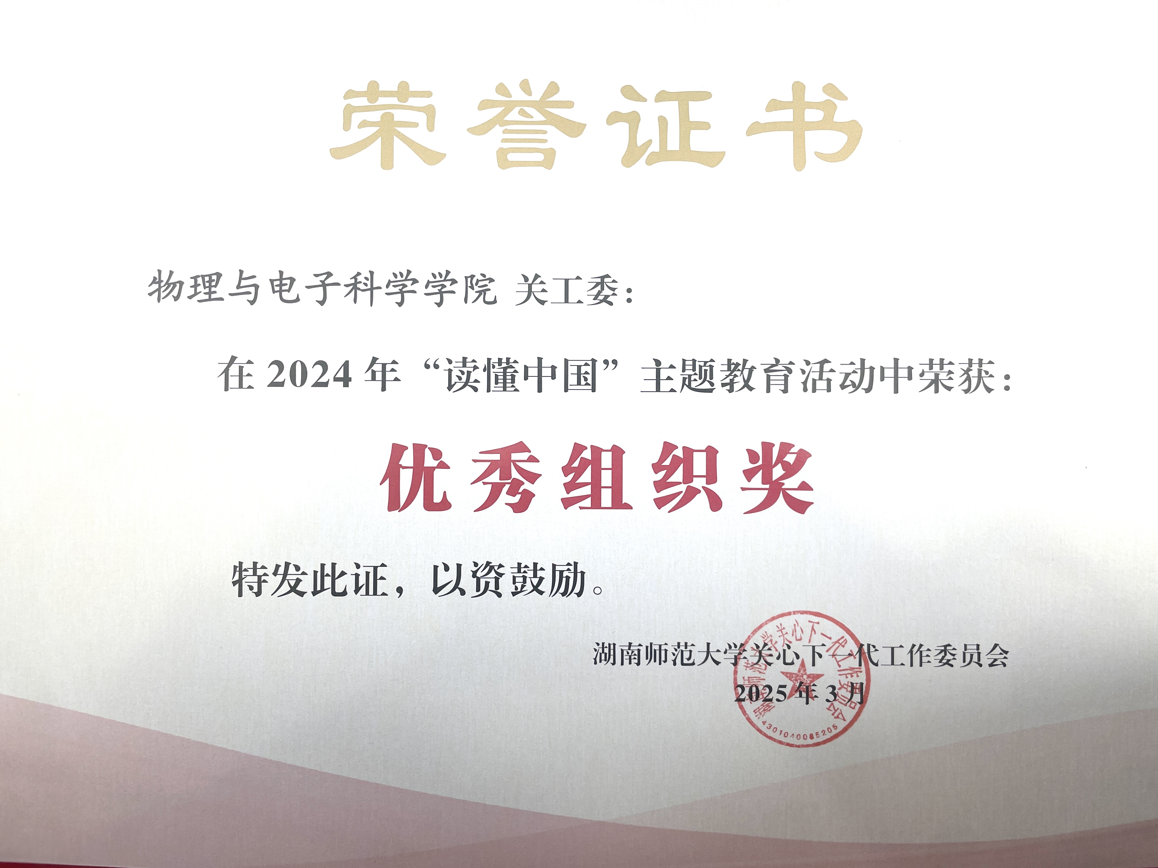 (通讯员 罗瑞霞)3月25日,伟德国际victor1946关工委于地理科学学院301报告厅召开2025年工作会议。物电院关工委荣获学校第一批“五好“基层关工委,“读懂中国”主题教育活动优秀组织单位,“一院一品”优秀项目单位,物电院关工委为包揽三大奖项的两家单位之一。院长刘红荣、党委书记罗嵘被评为“关工委工作积极支持者”,党委副书记郭铭伟、关工委常务副主任唐咸林被评为“关工委工作先进个人”。