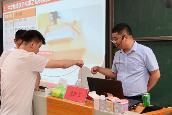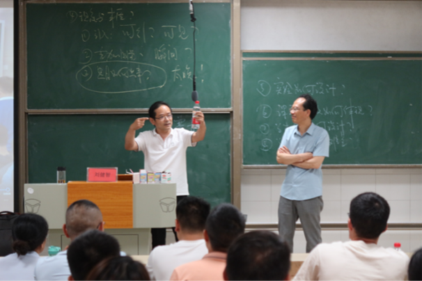 7月25日上午,湖南第一师范学院吴昌义教授带来了《中学物理演示实验设计与探索创新》专题讲座。本节讲座帮助学员们对实验教学有了全新的认识,物理实验课要就地取材、充分利用生活中的器具进行物理实验、加强物理知识和生活联系等等。他鼓励学员们在今后的物理实验教学中集思广益,不断探索改进实验方法,提高分组实验中学生的动手、操作能力和演示实验的可见度,全面提高实验课堂教学效果。