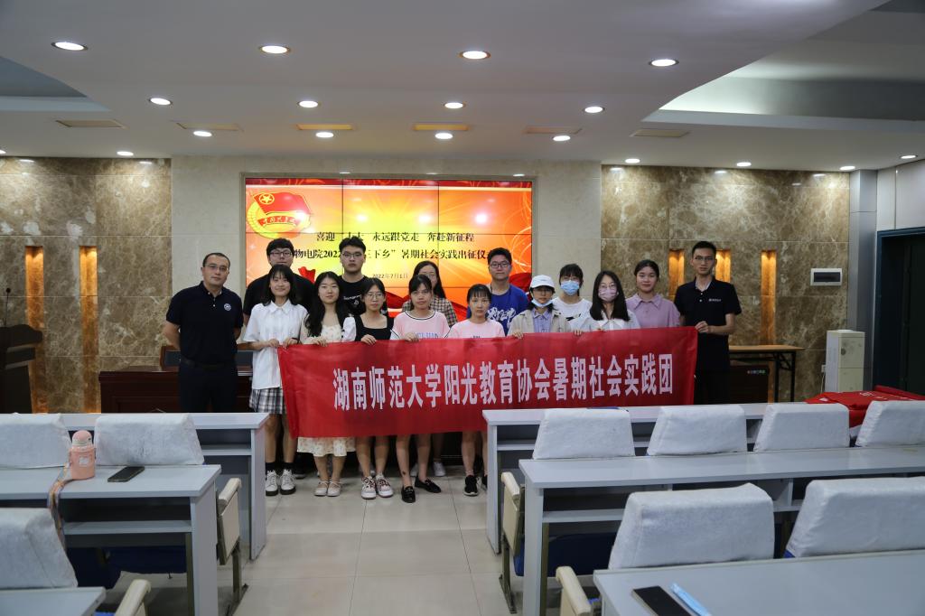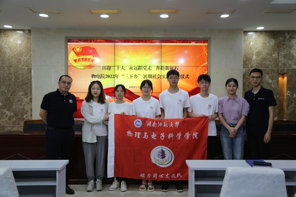 与会领导老师为各团队授旗并合影留念。学工办全体老师和暑期社会实践队全体成员参加此次活动。