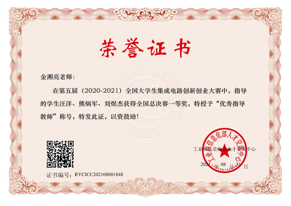 近日,第五届全国大学生集成电路创新创业大赛总决赛在重庆举行,由学院组织,金湘亮教授指导的汪洋、熊炳军、刘煜杰同学完成的项目《极弱光探测用硅基SPAD机理、器件与集成研究》荣获一等奖,金湘亮老师荣获优秀指导教师称号。