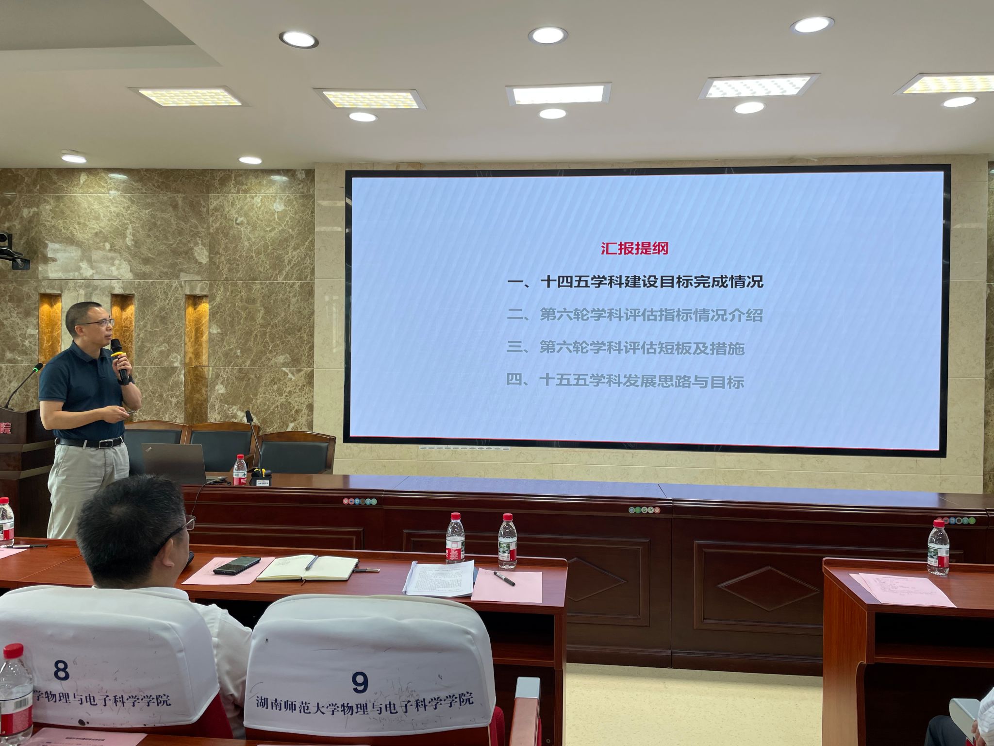 各职能部门领导分别发言,为学科建设提供了具体支持和指导。发展规划与学科建设处处长孙岳兵详细介绍了第六轮学科评估评价指标体系的最新形势和动态,为学科建设指明了努力的方向,他希望学科抓紧最后半年时间努力破解问题短板,为学科迈向更高水平冲刺;教务处处长银海强强调本科生的培养在学科评估中的重要支撑作用,他表示教务处将全力支持物理学学科的建设;财务处处长匡尹俊表示将一如既往做好服务工作,为物理学学科高质量发展添砖加瓦;科技处副处长李云龙鼓励教师多报大项目、大奖励、多做成果转化,祝愿教师取得更多科研成果,助力学科发展;资产与实验室管理处副处长罗万才为学院取得的成绩表示欣喜,作为条件保障部门,资产与实验室管理处将全力做好服务工作;研究生院副院长邹永星承诺将努力做好研究生培养工作,一如既往地支持学院学科发展。