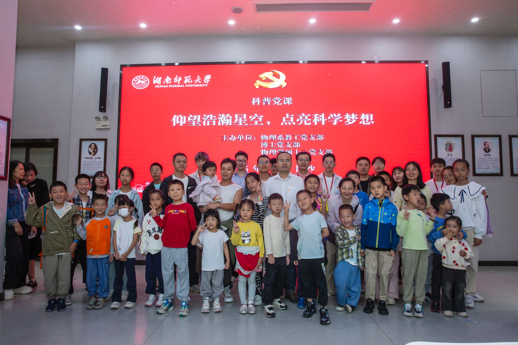 活动中,物理系教工党支部党员、湖南省“杰出青年基金” 获得者、学校天文学学位点负责人袁尊理教授带领参与活动的党员及青年师生化身“星空向导”,带领中小学生参观天文主题展览,组织现场天文观测,通俗讲解天文知识与宇宙奇观,为在场师生和家长打造了一场兼具视觉冲击与知识深度的 “星空课堂”。