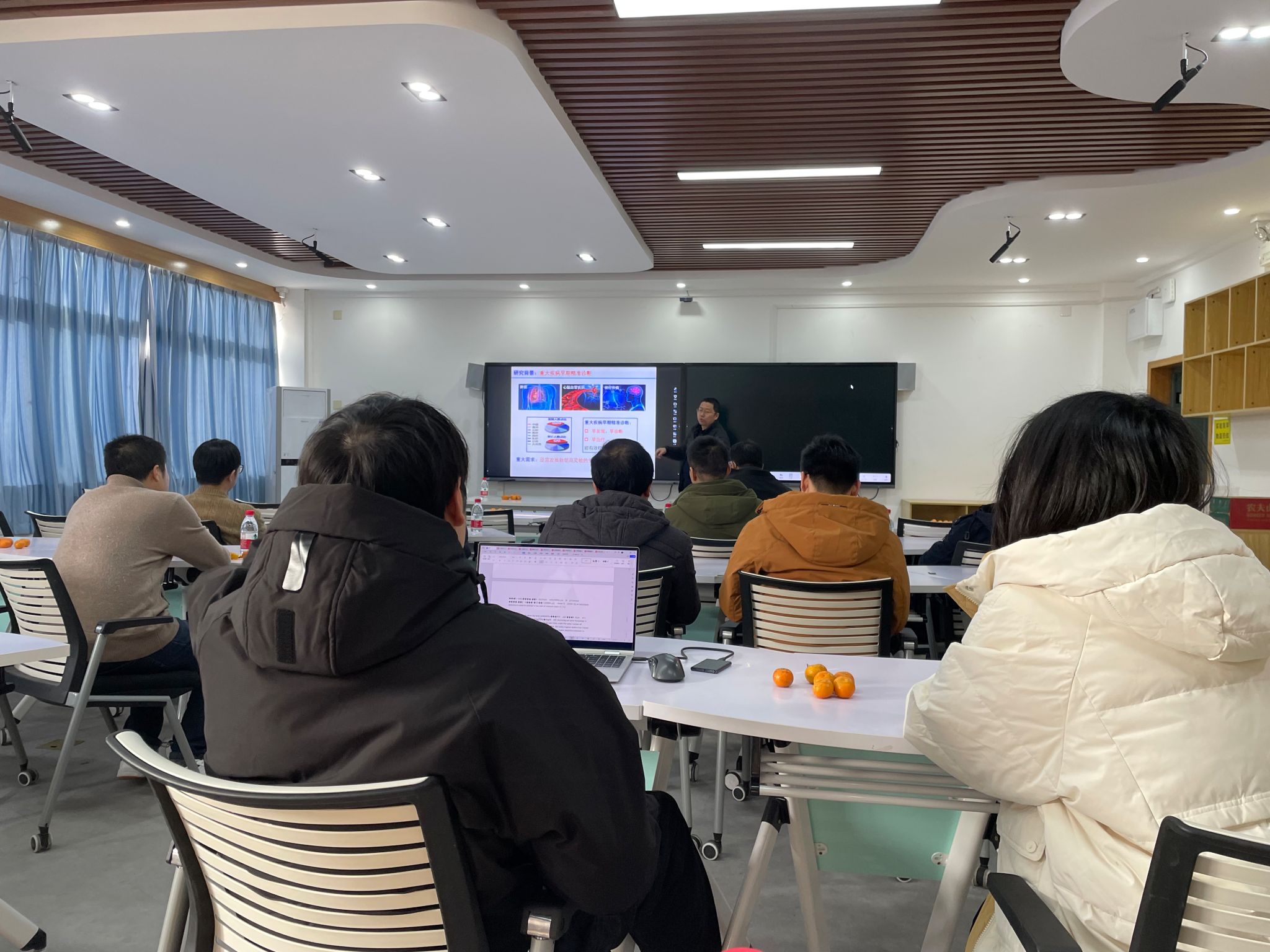 曾教授围绕“多功能光学纳米探针的设计及其成像和传感应用”这个主题从研究背景、研究方向和研究成果展开报告,详细介绍了以下三个研究成果:(1)高灵敏、高分辨NIR光学探针设计;(2)激活型NIR-II光学探针设计及传感应用;(3)纳米闪烁体-X-ray触发的气体治疗及PDT应用。曾教授报告深入浅出,逻辑清楚,在场师生收获颇多。